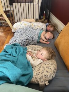 Sometimes the remaining two kiddos are ready for sleep quickly; sometimes there’s a maverick who isn’t ready to sleep till they read a dozen stories and get tickled and chased for an hour.
