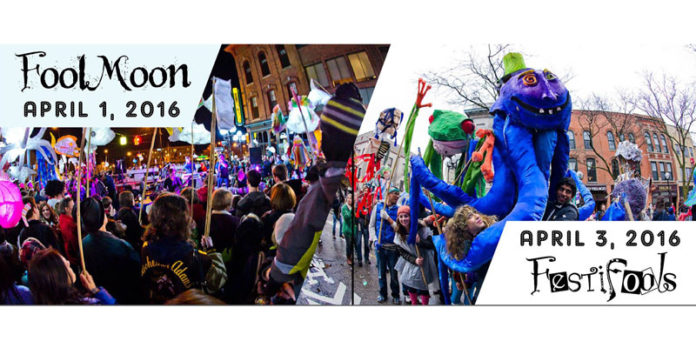 FoolMoon on Friday, April 1 (a very foolish day) begins with luminary processionals starting at 7:45 pm from the Kerrytown Farmer’s Market, UMMA, and Slauson Middle School.