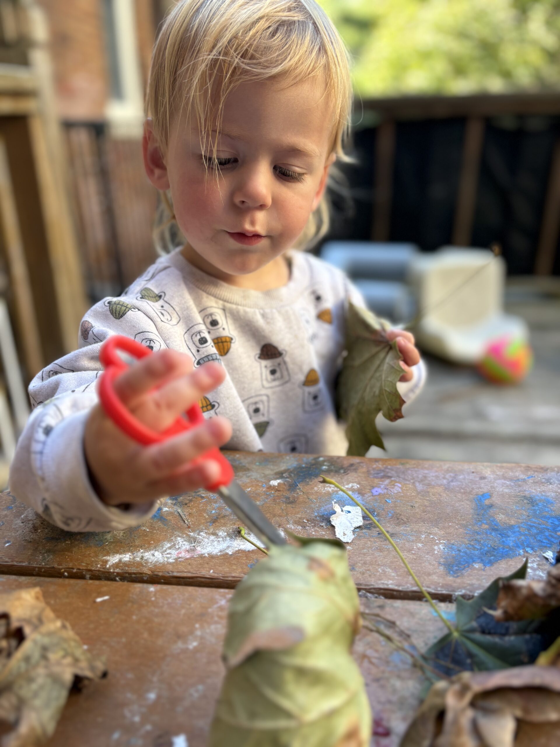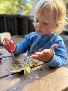 Variations for a baby: trace their skin with leaves so they experience it sensorially, and let them hold a firm leaf (although keep a careful eye in case they try their famed hand-to-mouth exploration).