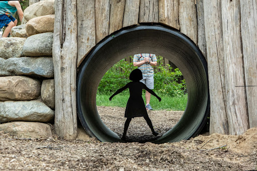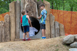 The Nature Playscape is designed with inclusivity in mind. Accessibility is built in as much as possible, allowing individuals to have access to a majority of the space, and opt-in within their comfort level. The future water play feature has several water pumps, and includes an intentional design element requiring multiple children’s participation to engage enough water to use certain features. This encourages collaboration and facilitates different experiences depending on how many people are using the space at one time.