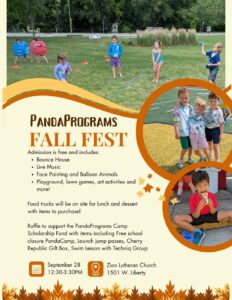 On September 28th, PandaPrograms will be holding PandaCamp Fall Fest in order to raise money for their scholarship fund. The event will take place at Zion Lutheran Church and will feature live music, food trucks, bounce house, face painting, playground space and much more. You can find the event on Facebook for more information.