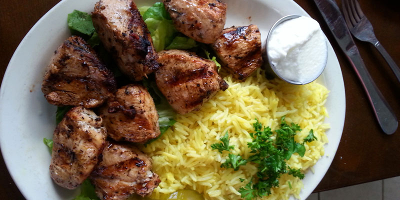 My son was ordering from Casablanca’s kid’s menu, which also offered a hamburger or pizza with a drink for $5.99. My daughter, 8, however, was drawn to Shish Tawook off the main menu. The two skewers of marinated chicken kabobs with garlic and herbs ($14.50) were served with soup or salad. She chose lentil soup with her grown-up entrée.