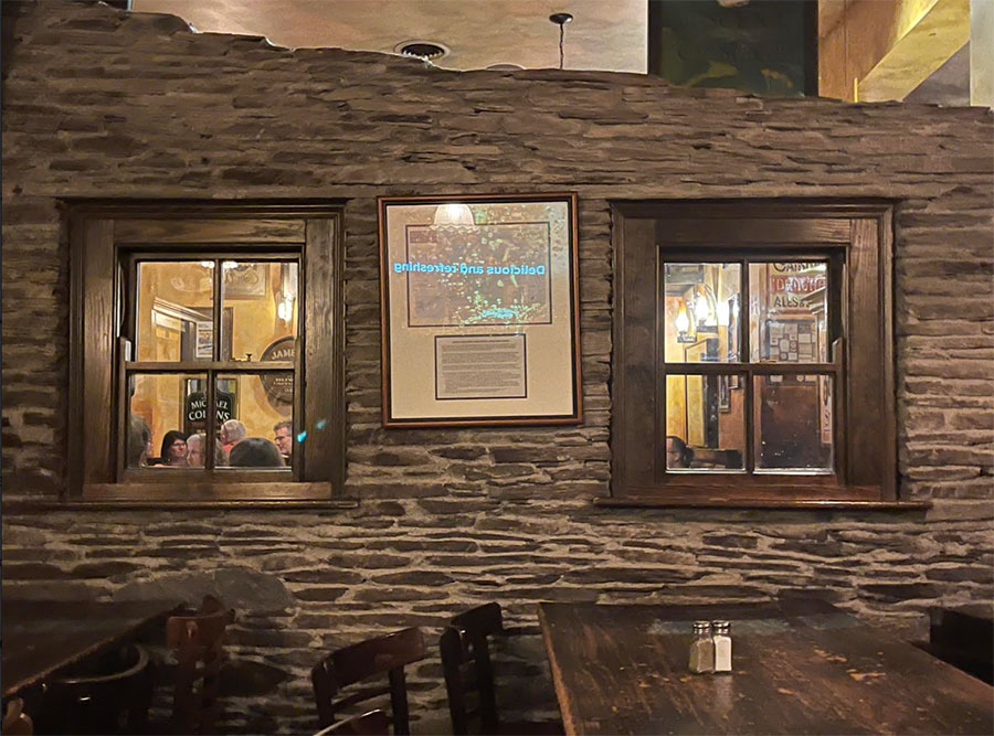“We have a writers’ section which has James Joyce, Yeats, and Brendan Behan,” Murray said. “We have a sports section, dedicated to Gaelic football and hurling.  We have a fishing and farming theme, with quotes on the wall like, ‘there are finer fish in the sea yet to be caught.’  We have a distillery section with old Bushmills barrels that have been turned into tables and a case of old bottle openers.  We have a Cottage section, with a fireplace and stone walls and floors. It has a quote on the wall that says, ‘You’ll never plough the field by turning it over in your mind.’”