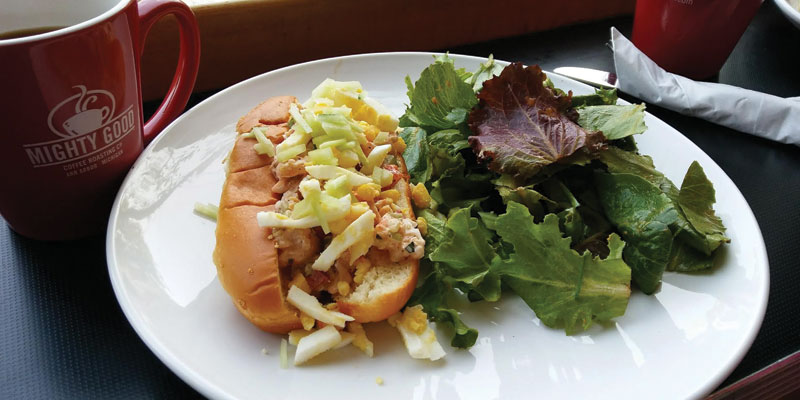 After my first visit, I returned with my 10-year-old daughter for brunch. I considered Huevos Rancheros and Salmon Hash before settling on the Shrimp Roll ($10) with homemade shrimp salad on a King’s Hawaiian roll. My daughter chose Pecan Pancakes ($9.50) with Michigan peaches in ginger syrup, and caramel sauce. Sides included a wedge of cantaloupe for her and spring greens for me.
