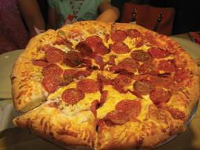 Supreme pizza with double pepperoni, provolone, mozzarella, Muenster and Parmesan cheeses plus a sprinkle of oregano ($15.29 for a large).