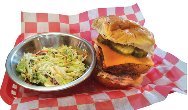 There is also a chicken “sammy” on an onion roll, with Gouda and cheddar cheeses, pickles and coleslaw ($10). The lone kid’s meal consists of three house tenders and one small side ($6). Drinks include fresh sweet tea, horchata, and assorted sodas ($1.75).