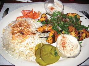 My husband’s entrée came with a small house salad, which he ate while the rest of us waited. We played a rousing game of I Spy using the restaurant’s Mediterranean décor, such as hookahs and desert paintings. When the main dishes were served, my husband commented, “This is the large?” His chicken kabob portion seemed just enough. He declared that the chicken breast marinated with saffron and the accompanying yogurt cucumber salad tasted good, but not great. My chicken shawarma was stuffed with tangy marinated chicken breast and thigh. However, I found the pita wrap slightly dry. I would have appreciated more pickles and garlic sauce (although my husband might disagree on the garlic sauce!) My almond rice was slightly undercooked.