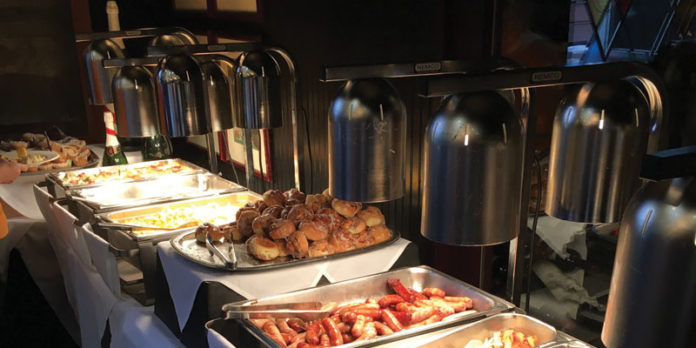 The buffet is replete with fresh fruit, greens, pasta and potato salads, plus baked goods such as brownies and coffee cakes, most made on-site in Weber’s bakery. There is an oatmeal bar with assorted toppings and hot food including vegetable lasagna, sausage links, Eggs Benedict, scrambled eggs, potatoes, corned beef hash, and biscuits and gravy.