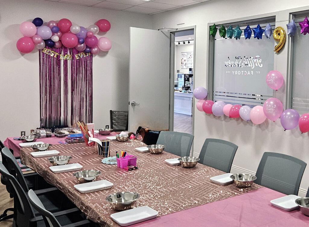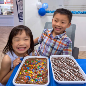 Each guest will make a personalized tray of chocolate bark and enjoy a milkshake in our private party room. We’ll decorate the room (which includes Wi-Fi and a smart TV) to match your theme, and our dedicated staff will assist every step of the way to ensure the party runs smoothly. You’re welcome to bring your own food or order from our full dessert menu, which includes gluten-friendly and non-dairy options.