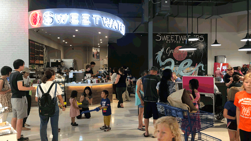 Renovations at the Ann Arbor-Saline Road Meijer have brought a variety of refreshment and caffeinated options at the Michigan-based Sweetwaters Coffee & Tea. The cafe area includes a hand-drawn chalk mural done by local artist, Michelle Abbey. If you’re lucky, you might run into Chop, Sweetwaters’ dragon who roams the store with free samples or pennies for a pony ride!