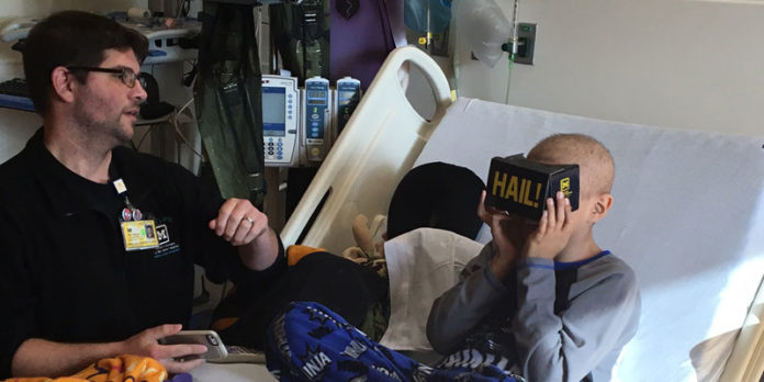 The viewers work by sliding in a smartphone and turning on virtual-reality apps through the phone. “The Jim Harbaugh Foundation is thrilled to support the Child and Family Life team at Mott Children’s,” says Sarah Harbaugh, who along with her husband, Jim, is a co-chair of the Victors for Michigan National Campaign Leadership Council for Mott and Von Voigtlander Hospital. “We are so inspired by the stories of Little Victors fighting such courageous battles every day. Programs run by the Child Life staff are critical to bringing a sense of normalcy for children and their families.” The new fund will cover the cost of cardboard viewers for every child and teen admitted at Mott. Patients can choose from a long list of virtual-reality apps available through smartphones.