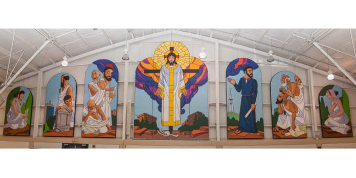 Anyone who has visited the St. Paul Lutheran School gymnasium (located at 495 Earhart Rd.) has noticed Grand Rapids-based artist Edward Riojas’ beautiful mural. Towering over the gymnasium, the mural features a depiction of St. Paul on Mars Hill, but with Ann Arbor landmarks like the Bell Tower and The Michigan Theater in the background. The inspiration for the piece, according to St. Paul Lutheran Pastor Don Neuendorf, came from the location of the building and the view it grants of Ann Arbor.