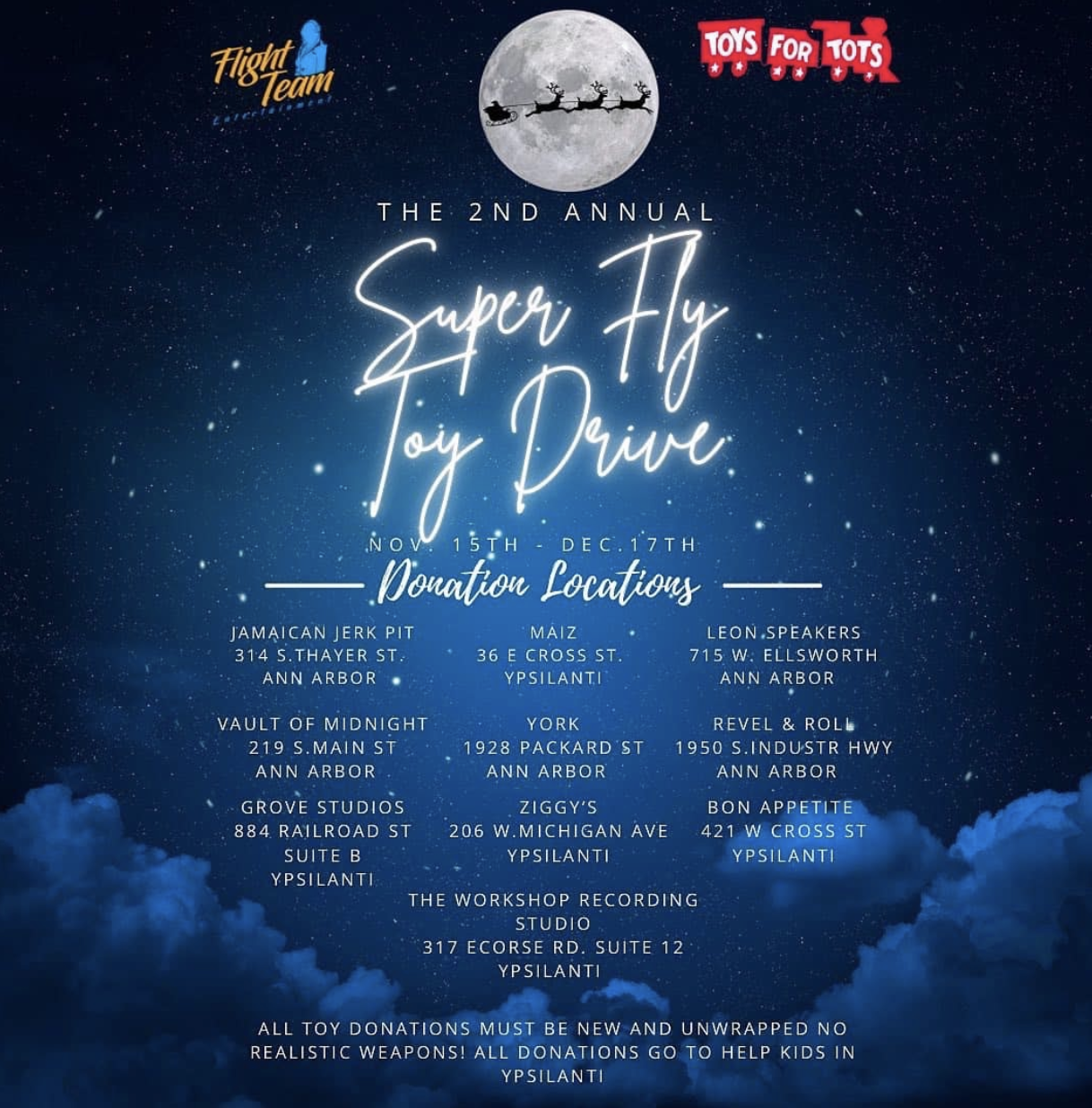 On Friday December 17, 2021at 8:00pm, Flight Team Entertainment will be holding their annual benefit concert titled “The Super Fly Toy Drive” at The Blind Pig! Â Partnering with Toys For Tots, all donations are going to families in need in Ypsilanti, MI.Â