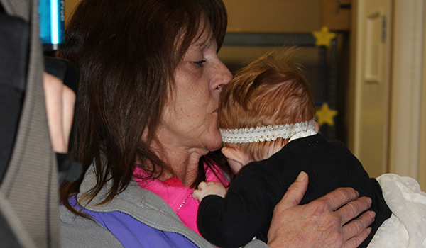 Tracy Rumfelt and baby Cassidy made a surprise appearance at the company meeting, where they greeted Dohn with a hug and their thanks.