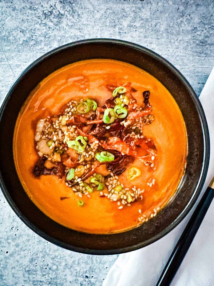 - SERVE. Ladle into bowls and top with crispy carrot peels, chili crisp, and the green parts of the sliced green onions. ENJOY!!